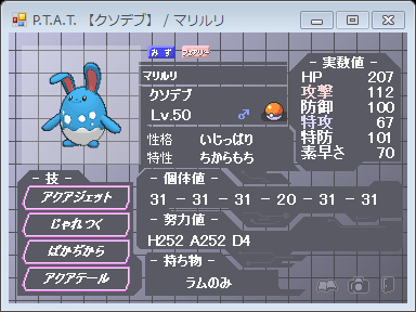 オボンはバンギに取られているので腹太鼓は不採用。こいつはアホみたいに火力があるので、ゴリ押しできるようにアクアテールを採用。アクアテールを入れてない人が多い(と思う)ので、意外と刺さる。