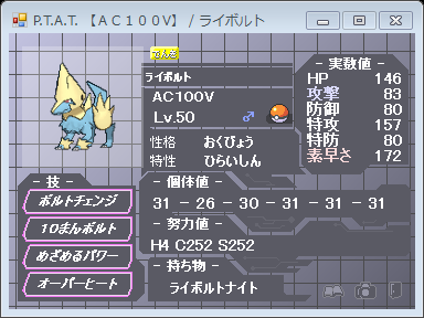 多くの特殊技が弱体化、さらにはすなおこしとオボンによりかなりの特殊耐久となっています。とつげきチョッキなどを持たせると、ステロ電磁波が使えなくなってしまうので、こちらの型の方が使いやすいと思ってオボンを持たせています。